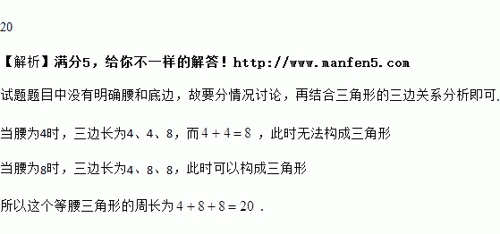 等腰三角形的两边长分别为4和8,则此等腰三角形的周长为________.