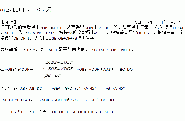 如图,平行四边形ABCD中,BD⊥AD,∠A=45°,E、F分别是AB、CD上的点,且BE=DF,连接EF交BD于O.