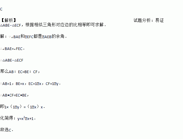 如图,正方形ABCD的边长为1,E、F分别是边BC和CD上的动点(不与正方形的顶点重合),不管E、F怎样动,始终保持AE⊥EF.设BE=x,DF=y,则y是x的函数,函数关系式是( )