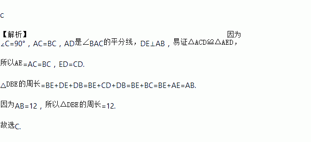 C 【解析】因为 ∠C=90°,AC=BC,AD是∠BAC的平分线,DE⊥AB,易证△ACD≌△AED, 所以AE=AC=BC,ED=CD. △DBE的周长=BE+DE+DB=BE+CD+DB=BE+BC=BE+AE=AB. 因为AB=12,所以△DBE的周长=12. 故选C.