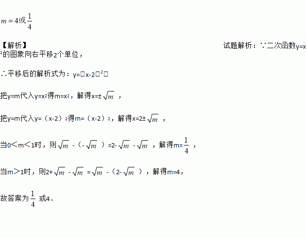 将函数y=x2的图象向右平移2个单位得函数y1的图象,将y与y1合起来构成新图象,直线y=m被新图象依次截得三段的长相等,则m=___________