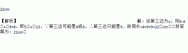 22cm 【解析】【解析】 设第三边为x,则9-4<x<9+4,即5<x<13,∵第三边可能是4或9,∴第三边只能是9.故周长=4+9+9=22(cm).故答案为:22cm.