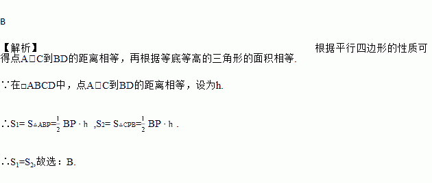 如图,P为□ABCD对角线BD上一点,△ABP的面积为S1,△CBP的面积为S2,则S1和S2的关系为 ( )