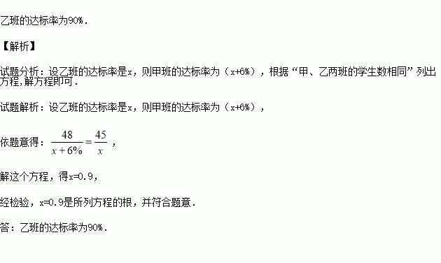 某校进行期末体育达标测试,甲、乙两班的学生数相同,甲班有48人达标,乙班有45人达标,甲班的达标率比乙班高6%,求乙班的达标率.