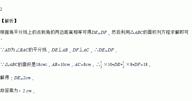 如图,在△ABC中,AD为∠BAC的平分线,DE⊥AB于点E,DF⊥AC于点F,△ABC的面积是18cm2,AB=10cm,AC=8cm,则DE=______.