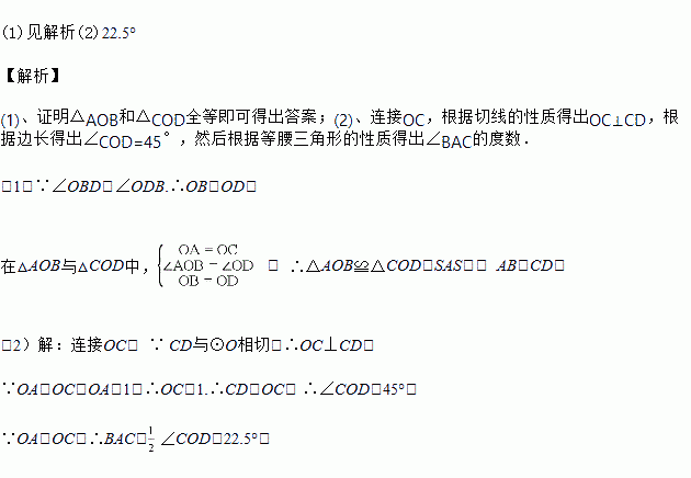 (2)如图,AB是⊙O的直径,OA=1,AC是⊙O的弦,过点C的切线交AB的延长线于点D,若OD=