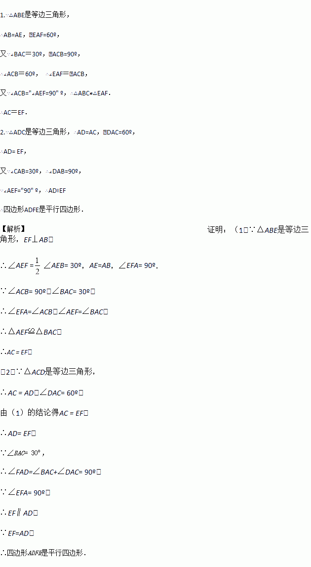 如图,分别以Rt△ABC的直角边AC及斜边AB向外作等边△ACD及等边△ABE.已知∠BAC=30°,EF⊥AB,垂足为F,连接DF.