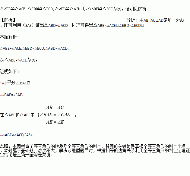 如图,在△ABC中,AB=AC,AD是角平分线,点E在AD上,请写出图中两对全等三角形,并选择其中的一对加以证明.