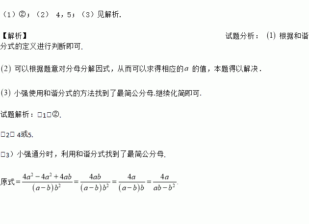 (1)②;(2) 4,5;(3)见解析. 【解析】试题分析: 根据和谐分式的定义进行判断即可. 可以根据题意对分母分解因式,从而可以求得相应的的值,本题得以解决. 小强使用和谐分式的方法找到了最简公分母.继续化简即可. 试题解析:(1)②. (2) 4或5. (3)小强通分时,利用和谐分式找到了最简公分母. 原式