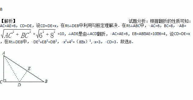 如图,有一块直角三角形纸片,两直角边AC=6cm,BC=8cm.现将直角边AC沿直线AD折叠,使它落在斜边AB上,且与AE重合,则CD等于( )