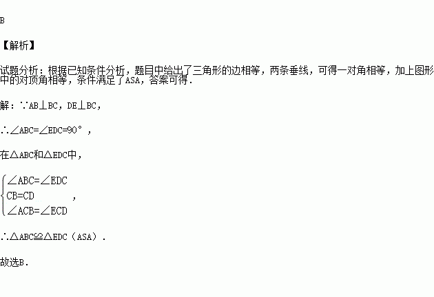 如图,要测量河两岸相对的两点A、B间的距离,先在过点B的AB的垂线l上取两点C、D,使CD=BC,再在过D的垂线上取点E,使A、C、E在一条直线上,这时△ACB≌△ECD,DE=AB.测得DE的长就是A、B的距离,这里判断△ACB≌△ECD的理由是( )
