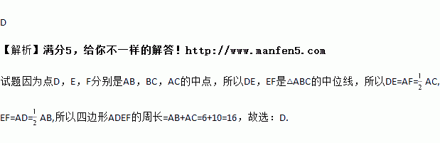 如图,在△ABC中,AB=6,AC=10,点D,E,F分别是AB,BC,AC的中点,则四边形ADEF的周长为( )