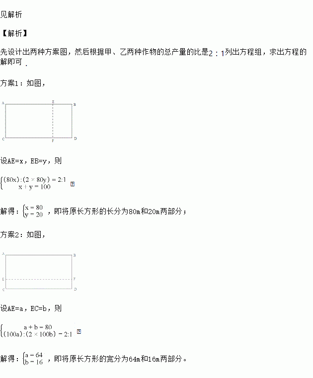 据统计资料,甲、乙两种作物的单位面积产量的比是1:2,现要把一块长100m、宽80m的长方形土地分为两块小长方形土地,分别种植这两种作物,怎样划分这块土地,使甲、乙两种作物的总产量的比是2:1?请你设计两种不同的种植方案.