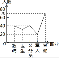(2)用总人数乘以医生所占的百分比求出医生的人数,再用总人数减去医生、公务员、军人和其他的人数,求出教师的人数,从而补全折线统计图;