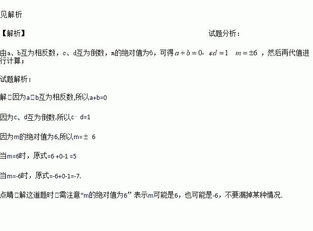 a、b互为相反数,c、d互为倒数,m的绝对值为6,求 的值.