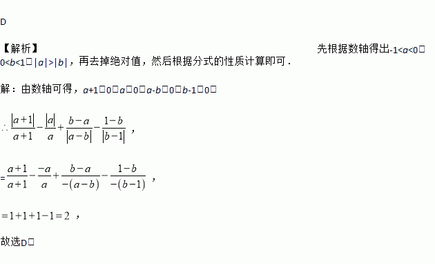 D 【解析】先根据数轴得出-1|b|,再去掉绝对值,然后根据分式的性质计算即可. 【解析】 由数轴可得,a+1>0,a<0,a-b<0,b-1<0, , =, , 故选D.