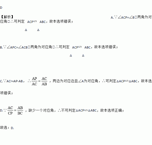 A. ∠ACP=∠B B. ∠APC=∠ACB C. AC2=AP·AB D.