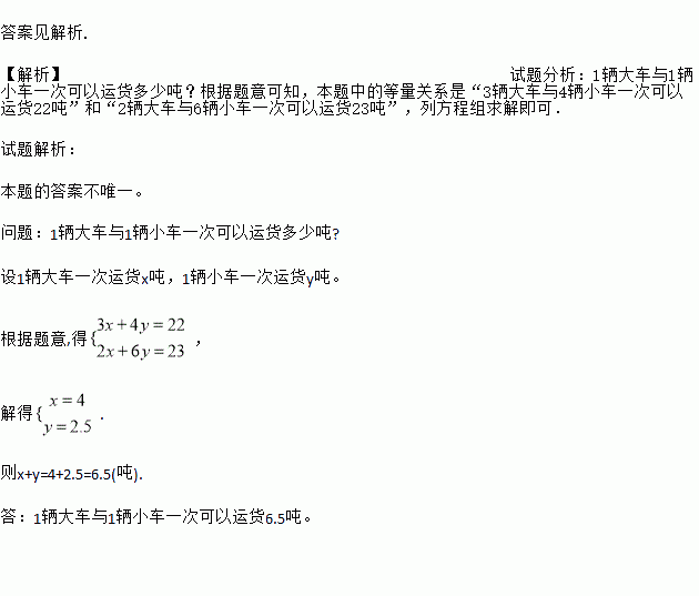 由大小两种货车,3辆大车与4辆小车一次可以运货22吨,2辆大车与6辆小车一次可以运货23吨.请根据以上信息,提出一个能用二元一次方程组解决的问题,并写出这个问题的解答过程.