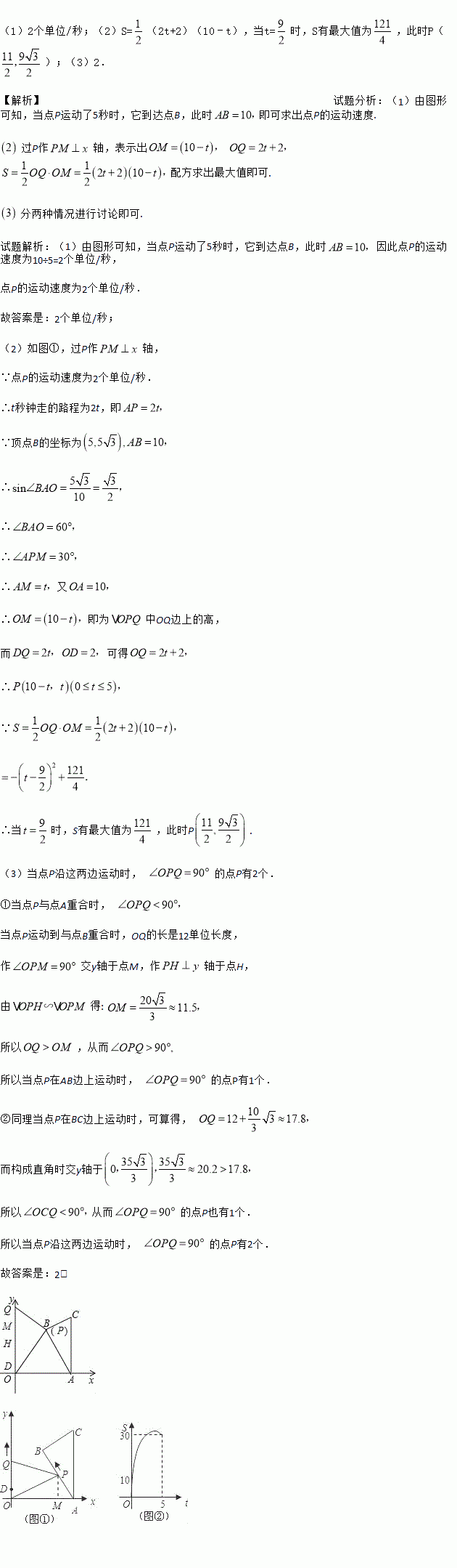 (1)当点P在AB上运动时,△OPQ的面积S(平方单位)与时间t(秒)之间的函数图象为抛物线的一部分,(如图②),则点P的运动速度为 ;