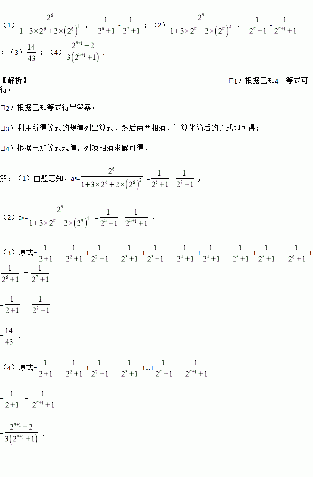 (1), -;(2), -;(3);(4). 【解析】(1)根据已知4个等式可得; (2)根据已知等式得出答案; (3)利用所得等式的规律列出算式,然后两两相消,计算化简后的算式即可得; (4)根据已知等式规律,列项相消求解可得. 【解析】 (1)由题意知,a6==-, (2)an==-, (3)原式=﹣+﹣+﹣+﹣+﹣+﹣ =﹣ =, ...
