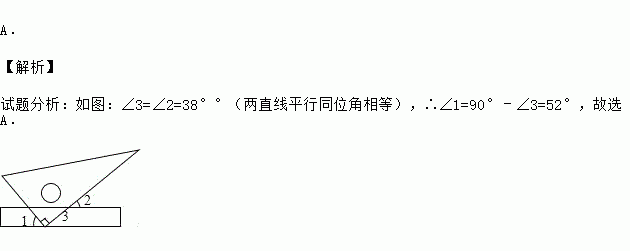 如图,将一块三角板的直角顶点放在直尺的一边上,当∠2=38°时,∠1=( )