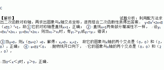 C 【解析】试题分析:利用配方法求出二次函数对称轴,再求出图象与x轴交点坐标,进而结合二次函数性质得出答案. y=﹣x2+2x=﹣(x﹣1)2+1,故①它的对称轴是直线x=1,正确; ②∵直线x=1两旁部分增减性不一样, ∴设y1=﹣x12+2x1,y2=﹣x22+2x2,则当x2>x1时,有y2>y1或y2<y1,错误; ③当y=0,则x(﹣x+2)=0,解得:x1=0,x2=2, ...