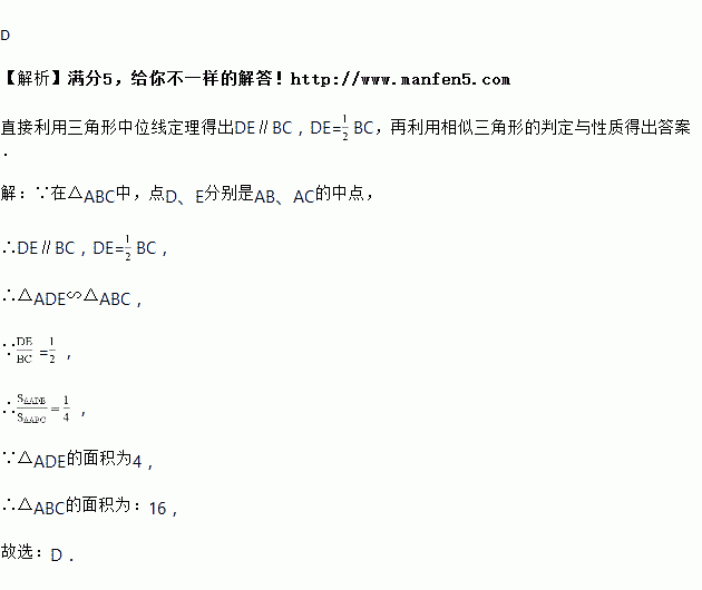 如图,在△ABC中,点D、E分别是AB、AC的中点,若△ADE的面积为4,则△ABC的面积为( )