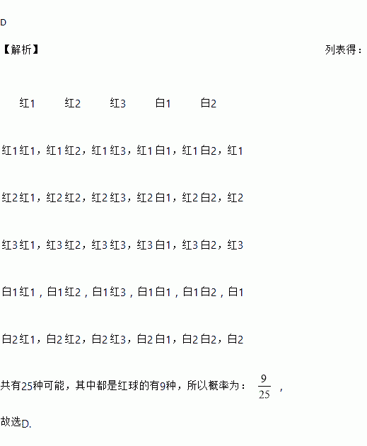 一个布袋里装有只有颜色不同的5个球,其中3个红球,2个白球.从中任意摸出1个球,记下颜色后放回,搅匀,再任意摸出1个球,摸出的2个球都是红球的概率是 ( )