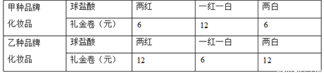 某化妆品专卖店,为了吸引顾客,准备在“母亲节”当天举办了甲、乙两种品牌化妆品有奖酬宾活动,凡购物满元,均可得到一次摇奖的机会.已知在摇奖机内装有个红球和个白球,除颜色外其它都相同,摇奖者必须从摇奖机中一次连续摇出两个球,根据球的颜色决定送礼金券的多少(如下表):