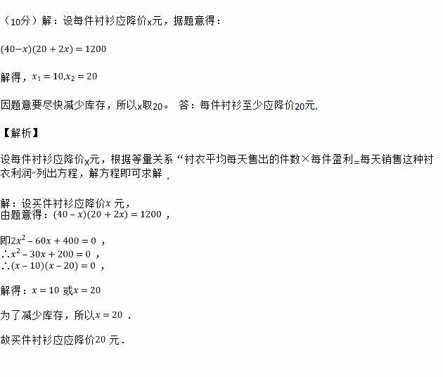 某商场销售一批名牌衬衫,平均每天可售出20件,每件盈利40元,为了扩大销售量,增加利润,尽快减少库存,商场决定采取适当的降价措施,经市场调查发现,如果每件衬衫降价1元,那么商场平均每天可多售出2件,若商场想平均每天盈利达1200元,那么买件衬衫应降价多少元?