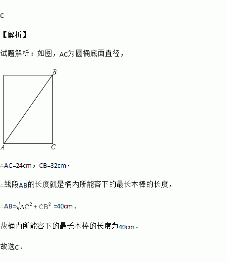 一个圆桶底面直径为24cm,高32cm,则桶内所能容下的最长木棒为( )