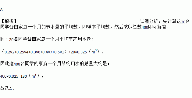 A 【解析】试题分析:先计算这20名同学各自家庭一个月的节水量的平均数,即样本平均数,然后乘以总数400即可解答. 【解析】 20名同学各自家庭一个月平均节约用水是: (0.2×2+0.25×4+0.3×6+0.4×7+0.5×1)÷20=0.325(m3), 因此这400名同学的家庭一个月节约用水的总量大约是: 400×0.325=130(m3), 故选A....