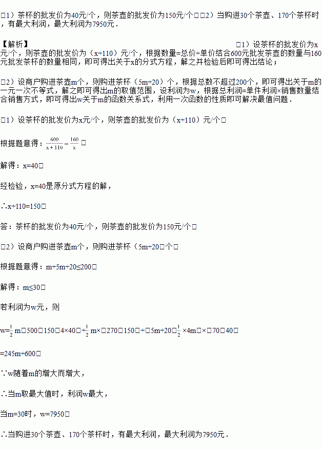 (2)若该商户购进茶杯的数量是茶壶数量的5倍还多20个,并且总数不超过200个,该商户打算将一半的茶具按每套500元成套销售,其余按每个茶壶270元,每个茶杯70元零售,请帮助他设计一种获取利润最大的方案,并求出最大利润.