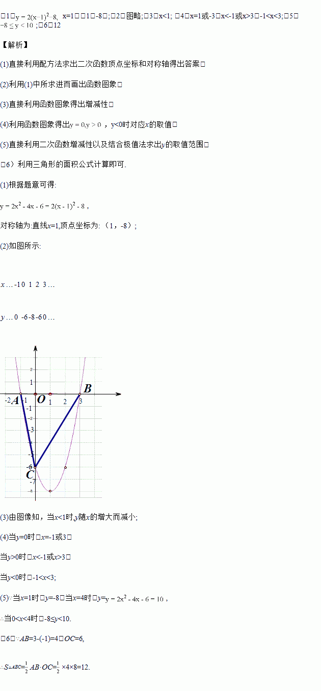 (1)用配方法将y = 2x2 -4x -6化成y = a (x - h) 2 + k的形式;并写出对称轴和顶点坐标。