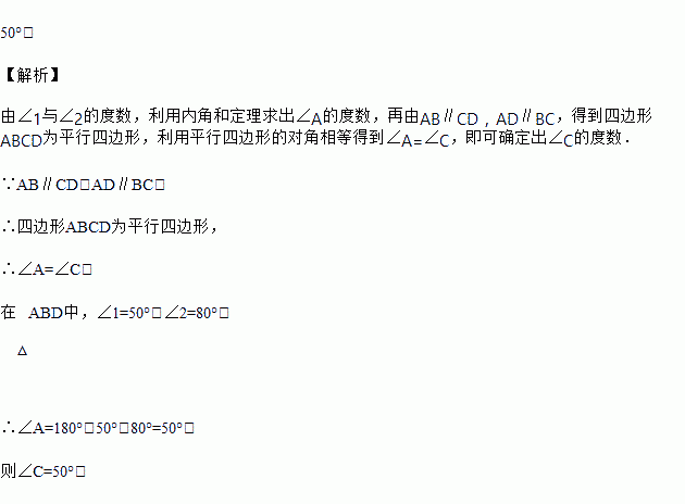 已知:如图,AB∥CD,AD∥BC,∠1=50°,∠2=80°.求∠C的度数.