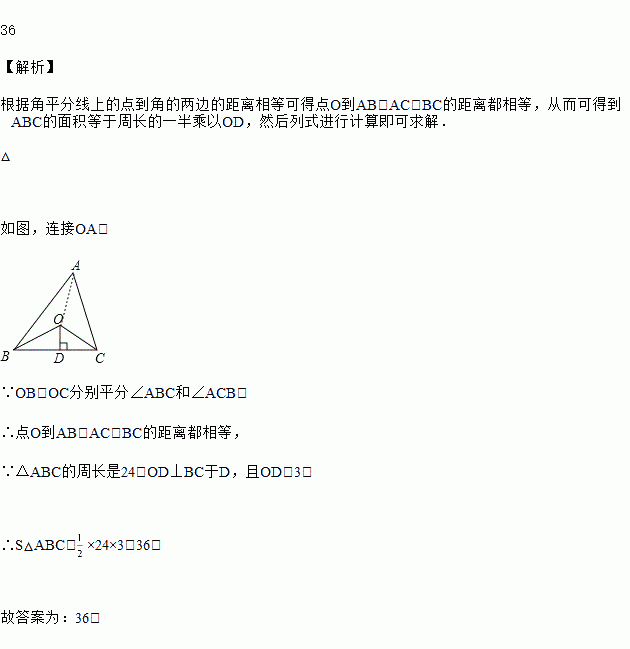 如图,已知△ABC的周长是24,OB,OC分别平分∠ABC和∠ACB,OD⊥BC于D,且OD=3,则△ABC的面积是________.