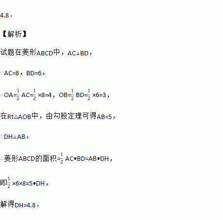 如图,菱形ABCD中,对角线AC与BD相交于点O,且AC=8,BD=6,则菱形ABCD的高DH= .
