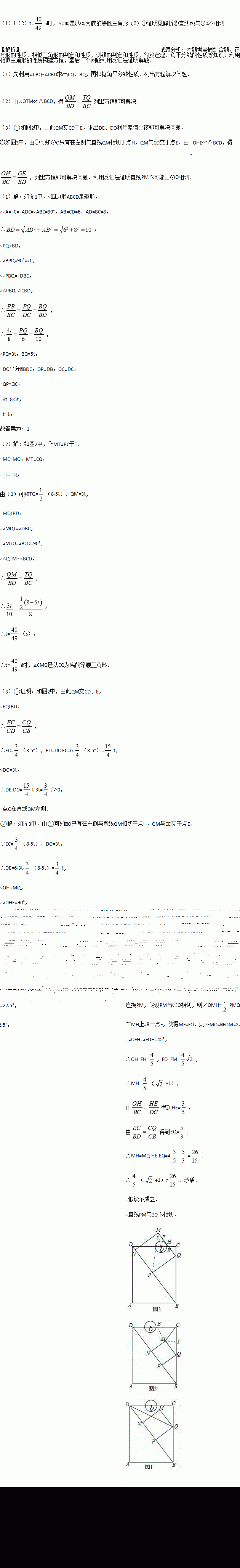 ②如图3,在运动过程中,当QM与圆O相切时,求t的值;并判断此时PM与圆O是否也相切?说明理由.