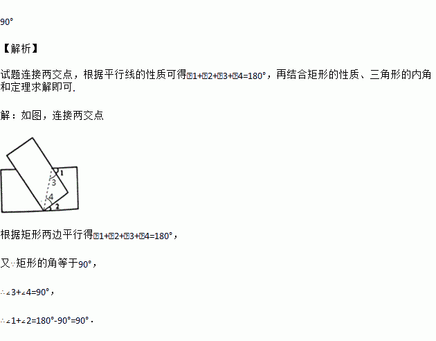 将两张矩形纸片如图所示摆放,使其中一张矩形纸片一个顶点恰好的落在另一张矩形纸片的一条边上,则∠1+∠2=________度.