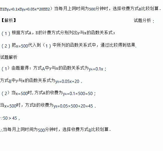 (1)yA=0.1x;yB=0.05x+20;(2)当每月上网时间为500分钟时,选择收费方式B比较划算. 【解析】试题分析: (1)根据方式A,B的计费方式分别列出y与x的函数关系式; (2)把x=500代入到(1)中所列的函数关系式中,通过比较得到结果. 试题解析 (1)由题意得:方式A中y与x的函数关系式为yA=0.1x; 方式B中y与x的函数关系式为yB...