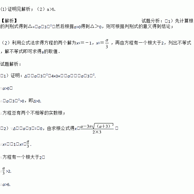 (1)证明见解析;(2)a>6. 【解析】试题分析:(1)先计算根的判别式得到△=(a+3)2,然后根据a>0得到△>0,则可根据判别式的意义得到结论; (2)利用公式法求得方程的两个解为x1=-1,x2=,再由方程有一个根大于2,列出不等式,解不等式即可求得a的取值. 试题解析: (1)证明:Δ=(a-3)2-4×3×(-a)=(a+3)2. ∵a>0, ∴(...