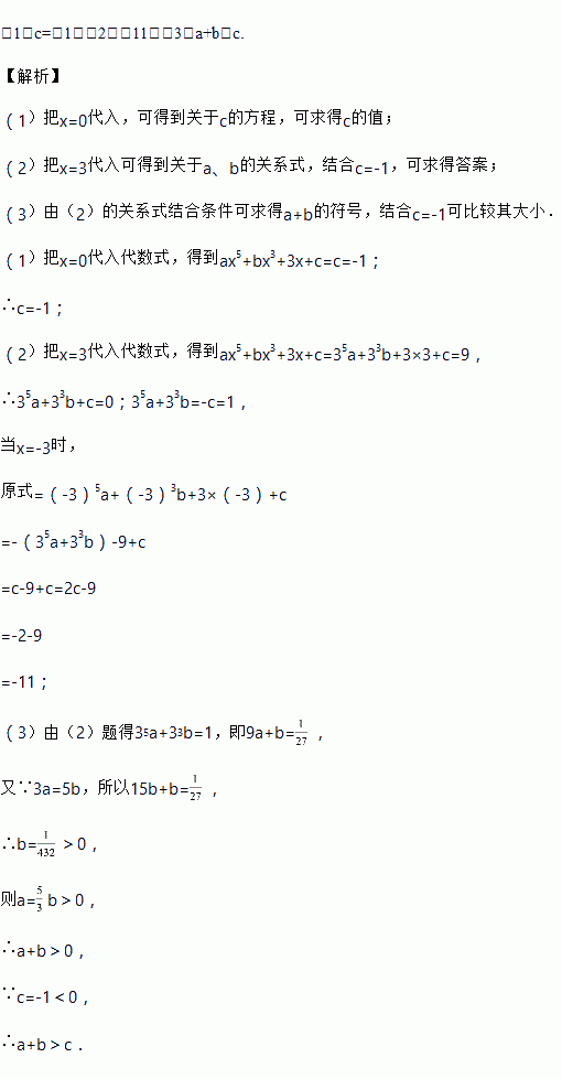 已知多项式ax5+bx3+3x+c,当x=0时,该代数式的值为﹣1.