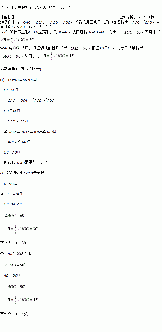 (2)填空:①当∠B= 时,四边形OCAD是菱形;