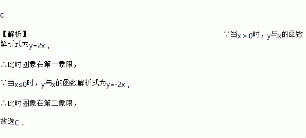 某图象,当x>0时,y与x间的函数解析式为y=2x,当x≤0时,y与x间的函数解析式为y=-2x,则在同一直角坐标系中的此图象大致为( )