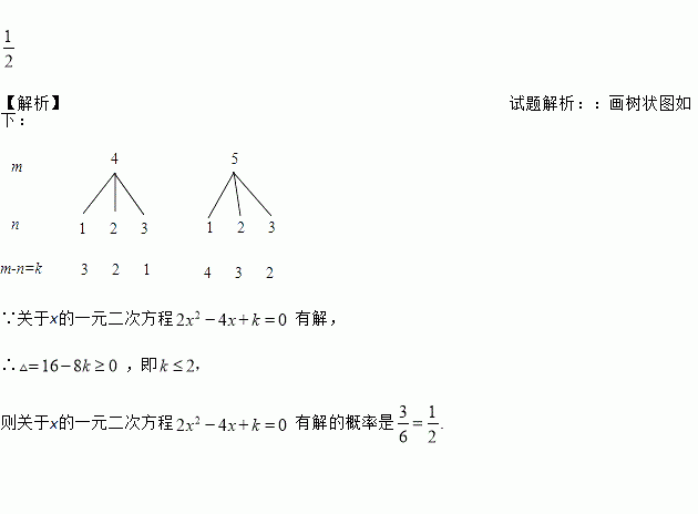 现有五个小球,每个小球上面分别标着1,2,3,4,5这五个数字中的一个,这些小球除标的数字不同以外,其余的全部相同.把分别标有数字4、5的两个小球放入不透明的口袋 A 中,把分别标有数字1、2、3的三个小球放入不透明的口袋 B 中.现随机从 A 和 B 两个口袋中各取出一个小球,把从 A 口袋中取出的小球上标的数字记作 m,从 B 口袋中取出的小球上标的数字记作n,且m﹣n=k,则关于x的一元二次方程2x2﹣4x+k=0有解的概率是________.