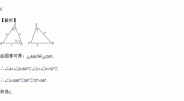 C 【解析】 由图像可得:△ABC≌△DEF, ∴∠A=∠D=50°,∠C=∠F=72°, ∴∠1=180°-50°-72°=58°. 故选C.