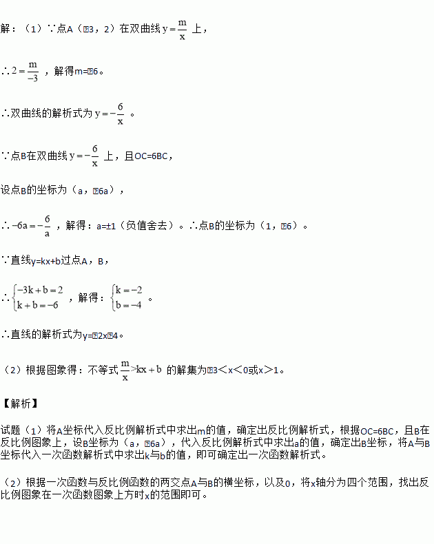 如图,在平面直角坐标系中,双曲线和直线y=kx+b交于A,B两点,点A的坐标为(﹣3,2),BC⊥y轴于点C,且OC=6BC.