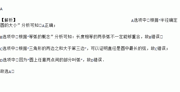 A. 半径相等的两个圆大小相等 B. 长度相等的两条弧是等弧