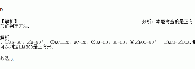 ①AB=BC,∠A=90°;②AC⊥BD,AC=BD;③OA=OD,BC=CD;④∠BOC=90°,∠ABD=∠DCA.