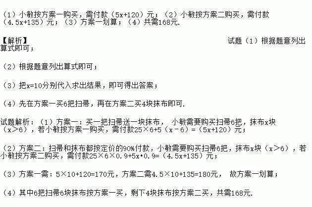 ¿ªÑ§ÆÚ¼ä£¬ÎªÁË´òɨÎÀÉú£¬°àÖ÷ÈÎÅÉÎÀÉúίԱСÃôÈ¥ÇṤÊг¡¹ºÂòһЩɨÖãºÍĨ ²¼.Ñ¡¶¨Ò»¼Òµêºó£¬ÀÏ°å¸æËßСÃô£¬É¨Öãÿ°Ñ25Ôª£¬Ä¨²¼Ã¿¿é5Ôª£¬ÏÖΪÁ˸ã´ÙÏú£¬ÓÐÁ½ÖÖÓŻݷ½°¸. ·½°¸Ò»£ºÂòÒ»°ÑɨÖãËÍÒ»¿éĨ²¼£»·½°¸¶þ£ºÉ¨ÖãºÍĨ²¼¶¼°´¶¨¼ÛµÄ90%¸¶¿î.